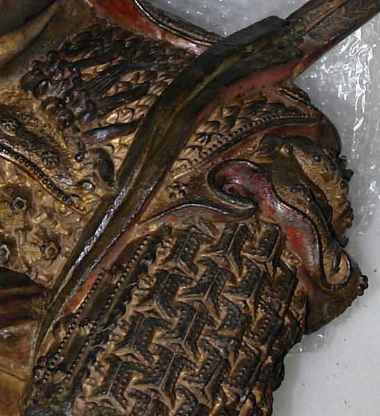 這種對實物進行抽象再造形成的紋飾影響了宋、元、明神像繪畫、石翁仲近千年的時間,這種由環鎖鎧演變成山文甲胄造型僅僅只存在於塑像和繪畫中。經過這樣的分解和分析,就能理解山西雙林寺韋陀像中甲裙的摺疊關係,按照中國傳統札甲的形態,這個表現是完全不成立的,只有鎖子甲才能達到這樣的隨意捲曲和摺疊,也說明了當年匠人在製作塑像時候,雖然明白鎖子甲的外形絕非如塑像所示,但是在某些細節中依然保留的鎖子甲的這些特徵。