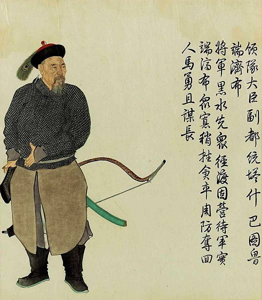 軍事博物館藏一套完整明代鎖子甲(圖22),是國內比較完整的鎖子甲,由直徑約6毫米左右編綴成,環直徑1毫米左右,每環都是鉚接而成,胸口部分每環的鉚接點有三個,肩肘部分環較細,編綴則沒有那麼緊密。 筆者收藏的鎖子甲與軍博的完全一致,並且還有一個由環鎖編綴的領子,與清代紫光閣功臣圖中「阿玉錫持矛蕩寇圖」中阿玉錫穿鎖子甲完全一致(圖23)。