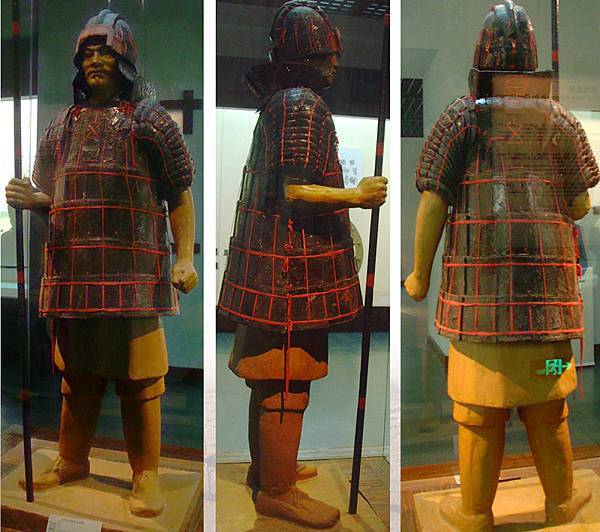 這種鎧甲的形象,在考古資料里是很多的,以刻於北魏永安二年(529年)寧懋石室線雕畫最為細緻。那是兩個相對的披甲武士,所披的盔甲正是明光鎧。胸甲左右有兩面大型圓護,腰間束著寬頻,在肩上披著披膊,大腿上蓋著腿裙,都是用甲片編成的。至於這一時期的隨葬陶俑群中,自北魏晚期開始,也都將其中體態最高大的甲胄武士裝鎮墓俑所穿鎧甲,塑成明光鎧。就目前已發現的資料而言,鎮墓武士大都身著明光鎧,而中國傳統的鎮墓武士形象往往與佛教中的護法天王、力士形象有關,因此,佛教在中土的傳播可能對於明光鎧在中國的發展起到了推波助瀾的作用。