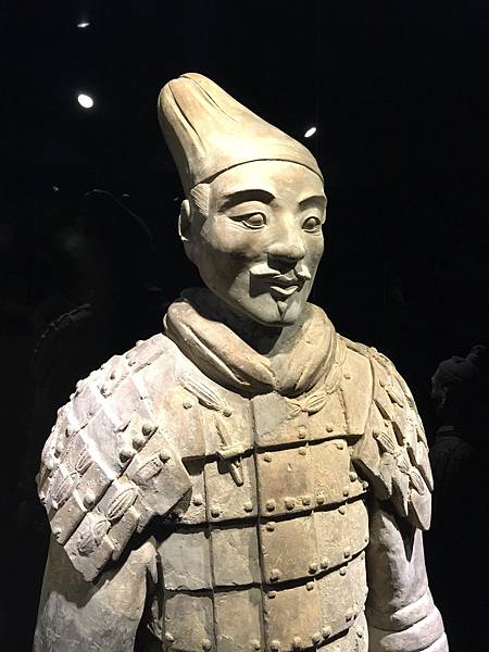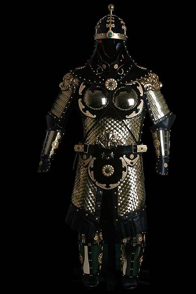 根據敦煌莫高窟264窟彩塑天王像所著鎧甲復原,由1590片魚鱗甲和644片長條甲編綴而成。明光鎧胸前和背後有金屬圓護,打磨的極光滑,頗似鏡子,在陽光的照射下,反射出耀眼的光芒,故名「明光鎧」。-「見日之光,天下大明」