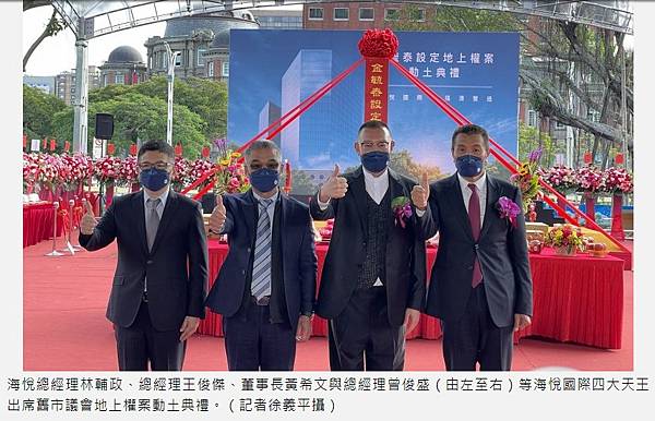 海悅總經理林輔政、總經理王俊傑、董事長黃希文與總經理曾俊盛(由左至右)等海悅國際四大天王出席舊市議會地上權案動土典禮。(記者徐義平攝)