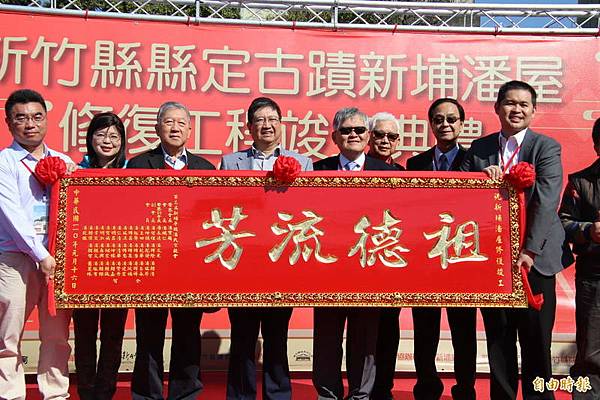 新竹縣縣長楊文科(左4)跟前任縣長邱鏡淳(左3)攜手頒贈「祖德流芳」匾額給新埔潘屋代表人潘鵬仁(左5),感謝潘家族人協助縣府活化古蹟。(記者黃美珠攝)