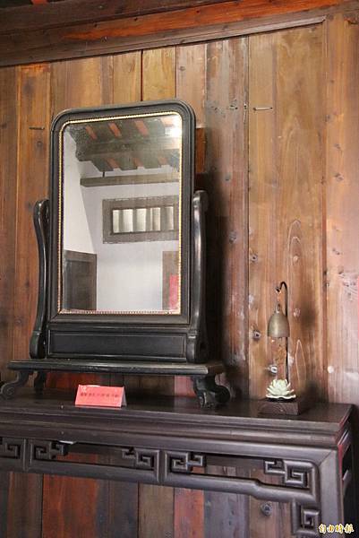 新埔潘屋左側內橫屋的古鏡和老鐘,隱含對入內參訪的來客「終生平靜」的祝福。(記者黃美珠攝)