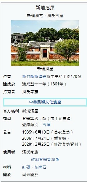 歷史沿革: 潘宅最早建於1815年,傳說潘宅位於風水上之「螃蟹穴」,因此建造成左右寬而前後短的形式,連屋頂也漆成藍色,以象徵生氣不息。潘宅的外牆有內、外兩道,內牆的牆門(院門),是用泉州白石建造的,門楣上橫批「孝友傳家」四個字,是因為潘家祖先潘榮光、潘清漢父子曾被清廷封為孝子,故以「孝友」之德行為家風。 景點介紹: 新埔潘宅是一座一堂四橫規模的建築,正身與左右橫屋間有一道圍牆,中有牆門,外橫屋又比內橫屋突出一開間,外橫屋間再增一道圍牆,使潘屋形成一座具有內外天警與外禾埕的宅院,外形有如螃蟹一般。特別的是正身五頂不用翹鵝,並將屋頂漆成藍色,以象徵螃蟹穴之生生不息。潘屋的牆身為卵石基腳、斗子砌土埆牆為主,外圍牆上的開口部以各式組砌的變化,讓磚牆有了生命,內圍牆的牆門以泉州白石砌成,以一道牆來表現門樓的意涵,是本古蹟的特色之一。 進入潘屋,適切的尺度,予人親切愉悅的感受,水車堵上的泥塑作品在時間的刻劃之下表現出殘缺的美感,又不掩其風華。整體而言,堅實的框構、嚴謹的空間組織以及層次分明的空間感,使得這座宅院獨具特色。 縣內法定文化資產-古蹟: 區域: 新埔鎮 ‧地址: 新竹縣 新埔鎮 新生里和平街170號 ‧是否開放: 否 ‧創建年代: 清咸豐十一年(1861年) ‧登錄理由: 具歷史文化保存價值 ‧公告文號: 七十四台內民字第238095號 ‧公告日期: 1985/8/19
