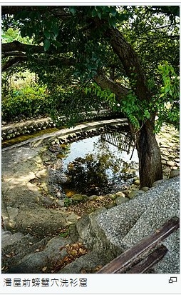 據鄉野傳說,潘家前面馬路下方,有一個泉水終年不絕的水池,池中不斷的冒出細水泡,宛如螃蟹吐泡沫,而潘宅位於「毛蟹穴」上,為風水之故,其建築左右寬而前後短,形如螃蟹,連屋頂也漆成藍色,做成硬山馬背的形式 潘氏古厝早期也是旺族,房子之所以沒有燕尾設計,也是因為風水的緣故。