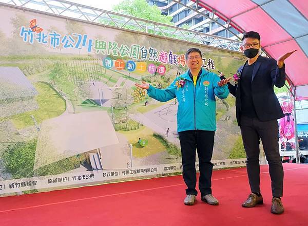 《圖說》竹北興隆公園將打造成七大主題全齡遊戲公園,縣長楊文科請鄉親拭目以待,右為新翊總設計師李吳博澄。(圖/新竹縣政府提供)竹縣首座特色公園動工 楊文科:22座自然遊戲場逐一現身 - 民眾網 https://bit.ly/3KqGrME