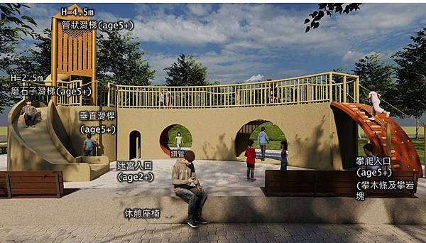惇陽工程顧問公司都市計畫技師高立新指出,公司在雙北設計不少特色公園,儘管竹北市的公園面積不大,但透過遊具的設計、組合,提供多種路徑讓孩子攀爬、變換,創造遊戲價值,並將擺盪、跳躍、平衡等元素,導入公園中,也強調滿足前庭覺的刺激,期望能讓孩子從遊戲中學習。