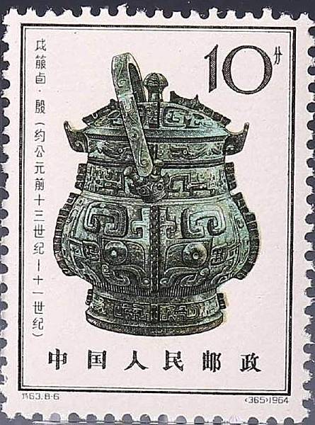 1964年8月25日,我國郵電部發行了特63《殷代銅器》特種郵票,全套8枚。郵票設計者為邵柏林,由北京郵票廠印製。其中第六枚(8-6)戉箙卣,面值10分,發行量100萬枚。此器物現存上海博物館青銅器館。