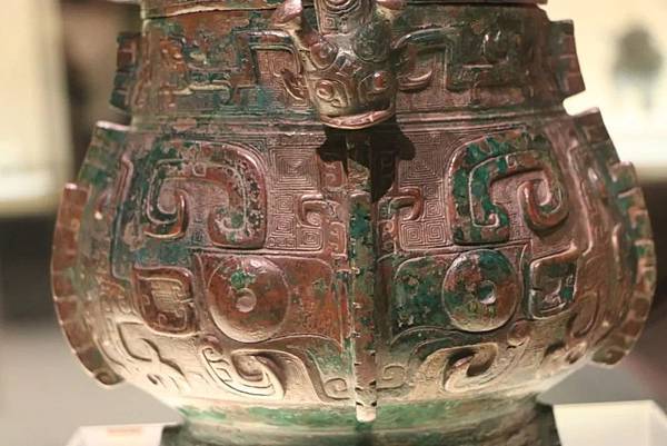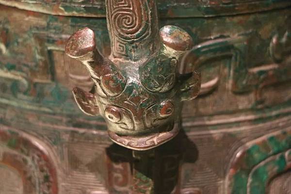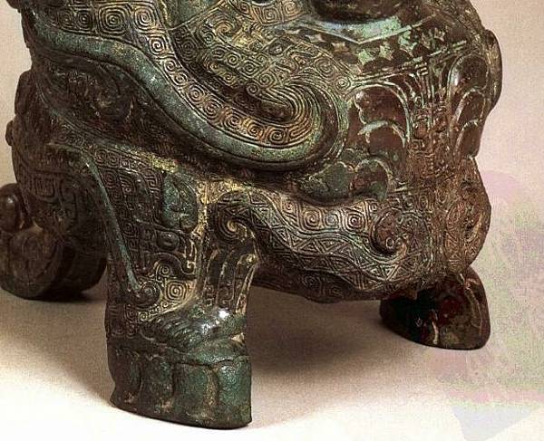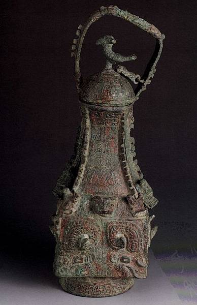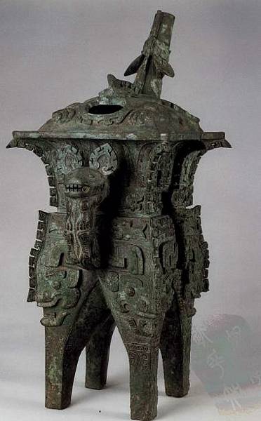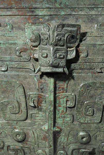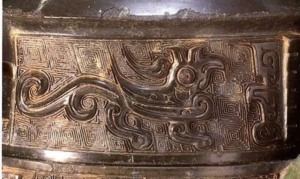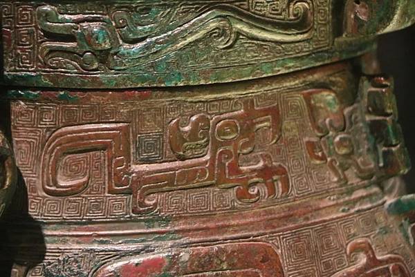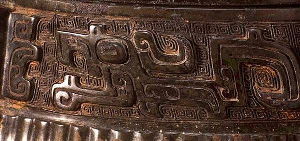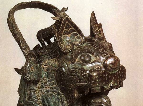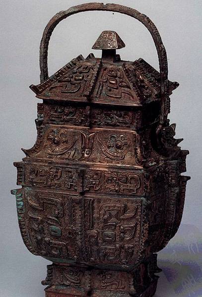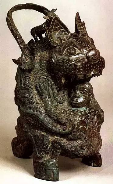 商代後期的青銅器提梁卣同樣紋飾繁縟,以人獸為主題,表現怪異的思想。可見獸面紋的確是一種神聖王權的象徵。君主掌握了獸面神器,就意味著人神合一,至尊高貴,即擁有神的權力,也成了神之子及其化身