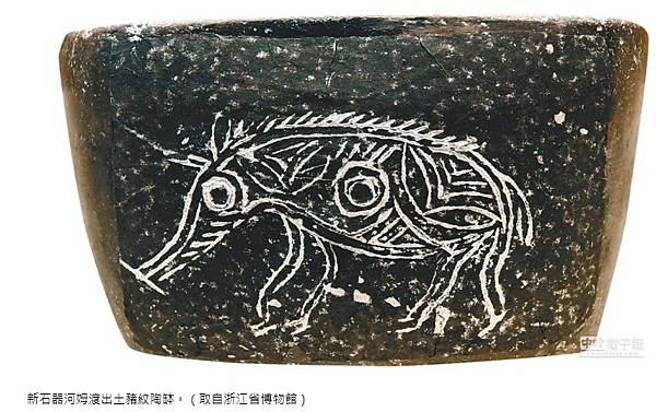 新石器河姆渡出土豬紋陶缽。(取自浙江省博物館)