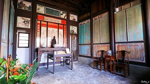 如同大多數在中港的居民一樣,當初陳家在此地亦是經營金銀紙加工業,左護龍門楣上的「槌韻」便是屋主小時常聽到的斬紙聲,用心的屋主將陳家的開發史以優美的文字呈現在古厝內的門簾上,屋內亦有展示重建過程中的影像紀錄,值得花點時間細細走讀。