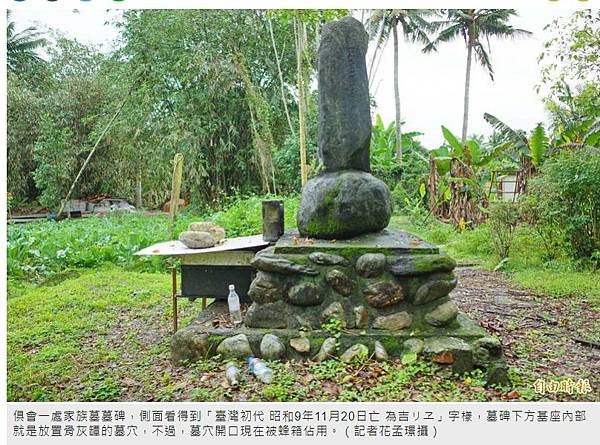 俱會一處家族墓墓碑,側面看得到「臺灣初代 昭和9年11月20日亡 為吉リヱ」字樣,墓碑下方基座內部就是放置骨灰罈的墓穴,不過,墓穴開口現在被蜂箱佔用。(記者花孟璟攝)