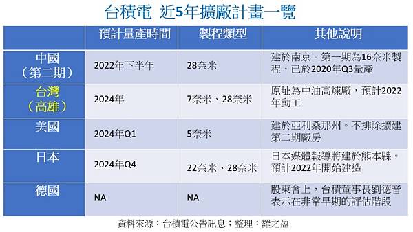 台積電熊本一廠預計第4季進入量產,美國亞利桑那州廠將延至2025年。