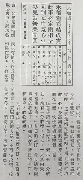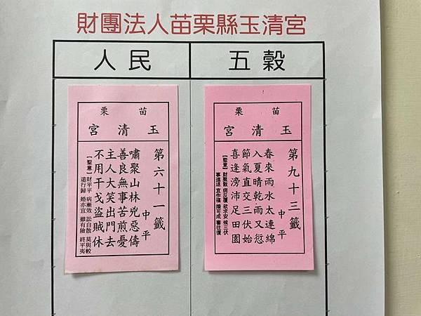 玉清宮今年抽出的公籤,「五穀」抽出的是第九十三籤,與去年是同一支,籤詩「春來雨水太連綿、入夏晴乾雨又愆、節氣直交三伏始、喜逢滂沛足田園」。
