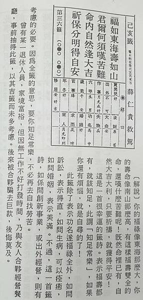農是中下籤,代表畫餅充飢,只能看、吃不到,今年的農業收成可能有一些狀況,執政當局要多警惕,注意天災人禍;工是大吉,先憂後吉,上半年景氣不好,下半年會反轉,逆轉勝;商是上上籤,剛開始被烏雲遮住,最後逢凶化吉,都是吉事。