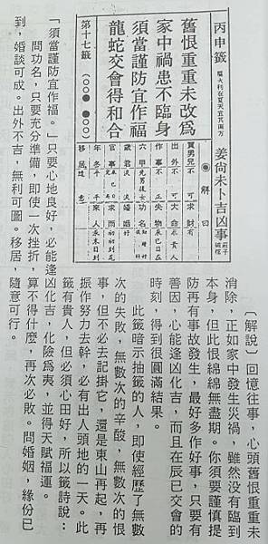 湧蓮寺管理委員會委員楊蓮福指出,代表政治、國運的士籤,本來是下中籤,但在解籤是以中吉籤看,講的是魏國人范睢投靠秦國,以遠交近攻的政策,使得秦國一統六國,代表未來整個局勢是先苦後甘,政治憂喜參半;從國勢來看,現在政局混沌不明,到底有利執政黨還是在野黨,仍看不出來。
