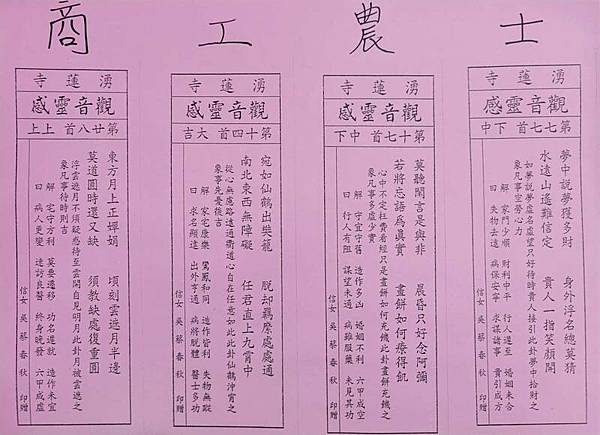 「人民」則為第六十一籤,籤詩「嘯聚山林兇惡儔、善良無事苦煎憂、主人大笑出門去、不用干戈盜賊休」。