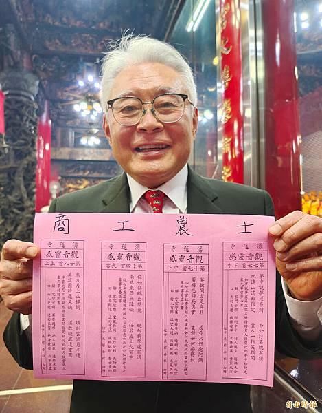 湧蓮寺主委陳宏昌抽出國運籤。(記者王藝菘攝)