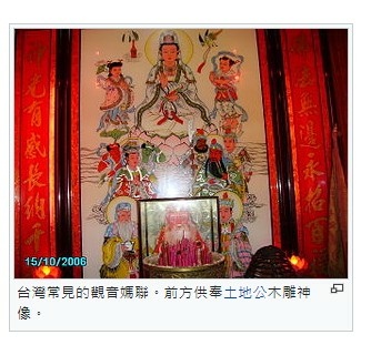 有佛教徒版本,上層為觀音,中層為地藏菩薩,左右為文殊菩薩與普賢菩薩,下層為灶君與土地公。