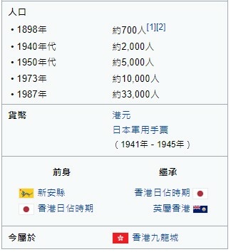 1899年前的九龍城寨,仍歸清朝駐軍管轄,地位相當於今日的中國領事館。直到該年5月英軍入侵,趕走城內的清朝官員,使得之後的城寨一度荒廢,幾乎無人居住。二戰期間的日軍為了擴建渠道,拆毀了九龍城寨的古城牆。