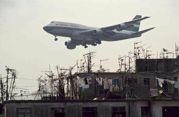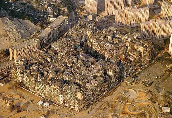 被清拆前的九龍城寨,大樓約十層高,一幢挨著一幢,密密麻麻,在天台上只要跨一小步,就能走到隔壁大樓。天台的女兒牆處處是用水管駕起俗稱「魚骨」的電視天線,颱風過後,天線被打得七歪八斜,得重新調校,電視才能收到訊號,不然看到的是片片雪花。站在天台高處,九龍城至香港島的太平山盡收眼底,啟德機場在不遠處,飛機從九龍城轟隆轟隆緩降向機場跑道,巨無霸的飛機就在眼前掠過。城寨內的街道暗無天日,頭頂可見的是看似欲墜的電線和水管,水管日夜滴水,無人修葺,邊走要邊提防被水滴到。街巷暗弄濕漉漉的,濕氣甚重,老鼠橫行,暗角隨時會蹦出一隻,和行人擦脚而過。