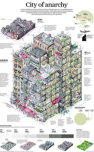 「九龍城寨是一個英國和中國都聲稱自己擁有主權的圍城,它吸引許多移民和投機分子,也是一個龍蛇混雜的地方。它既是癮君子和黑社會的地盤,也是生意人和學齡孩童的家。」_《華爾街日報》