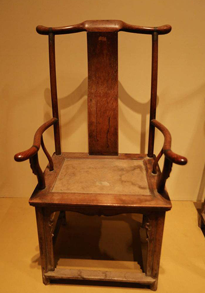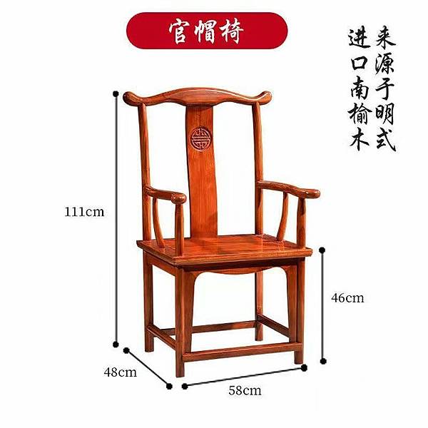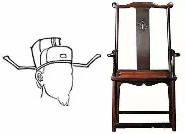 古代官帽均為前低後高,明顯的分成兩部分。若將椅子與官帽對比,尤其從椅子的側面看,扶手略如帽子的前部,椅背如帽子的後部……