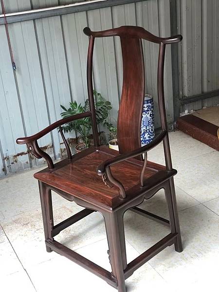 一把器型做得很到位的大紅酸枝四出頭官帽椅,品質上等