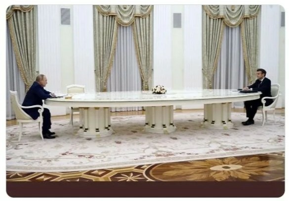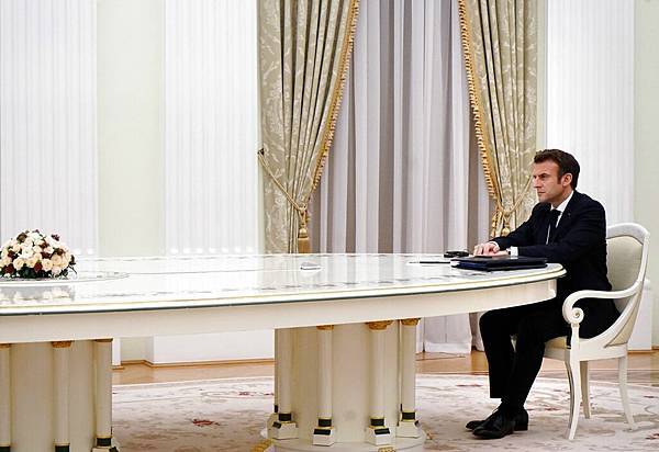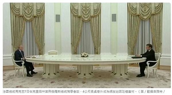 法國總統馬克宏7日晚在克里姆林宮與俄羅斯總統蒲亭會談5個半小時,雙方在會後記者會表示,將盡力尋找折中之道,維持歐洲和平。會談時4公尺長桌意外成為網友迷因吐槽素材。