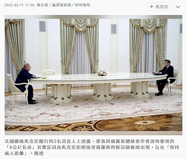 法國總統馬克宏隨行的2名消息人士透露,那張與俄羅斯總統普亭會談時使用的「4公尺長桌」其實是因為馬克宏拒絕接受俄羅斯的新冠篩檢而出現,旨在「保持兩人距離」。路透