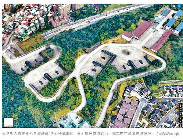 國防部近來在全台各地增建12個飛彈陣地,全面提升空防戰力。圖為新店飛彈布防概況。(翻攝Google Maps)