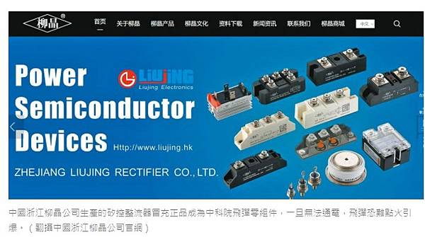 中國浙江柳晶公司生產的矽控整流器冒充正品成為中科院飛彈零組件,一旦無法通電,飛彈恐難點火引爆。(翻攝中國浙江柳晶公司官網)