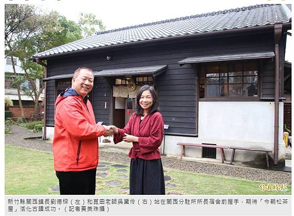 新竹縣關西鎮長劉德樑(左)和崑曲老師吳黛伶(右)站在關西分駐所所長宿舍前握手,期待「今朝松茶屋」活化古蹟成功。(記者黃美珠攝)