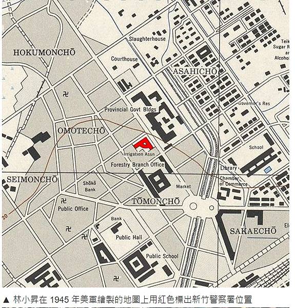 ▲ 林小昇在 1945 年美軍繪製的地圖上用紅色標出新竹警察署位置