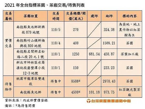 進一步觀察2021年實價登錄,全台有4筆備註茶園的相關不動產交易,共有3筆出現在南投,1筆在坪林,且金額都不大。南投縣名間鄉名松路二段的一處茶葉加工廠,去年1月以1250萬元交易;而南投魚池鄉及竹山鎮成交總價分別為270萬元、400萬元;新北坪林區233.33坪的茶園僅以150萬元成交。