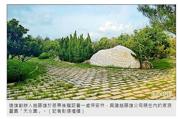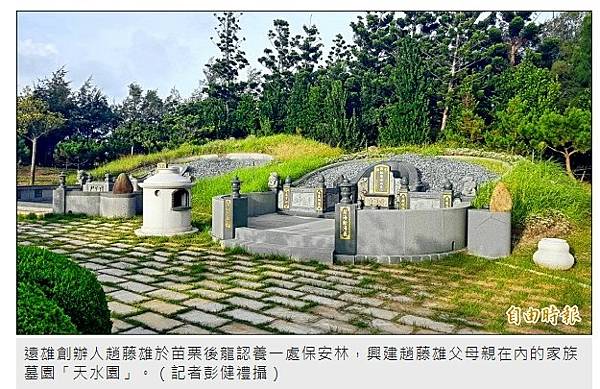 趙藤雄的家族墓園「天水園」位於苗栗後龍,他看上該處風水好,因此將祖墳遷往天水園。