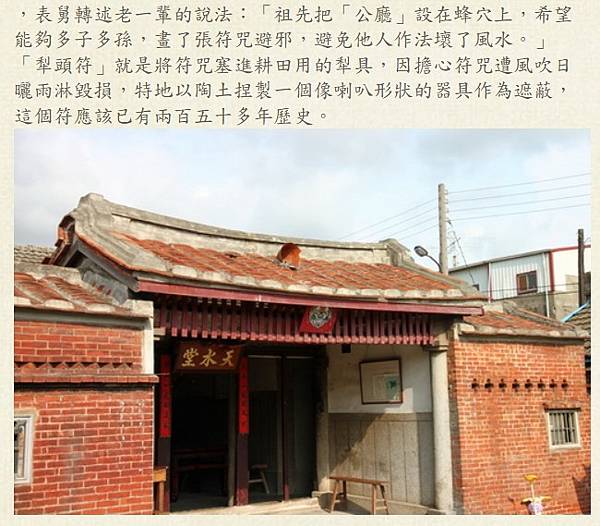 此外,天水堂的屋頂有至今仍保留一座形狀像喇叭的「犁頭符」,趙政忠表示,根據耆老的說法,古祖先把「公廳」設在蜂穴上,希望能夠多子多孫,畫了張符咒,就是讓外人或者邪魔看不到趙家,不讓外入入侵,保護著趙家子孫。