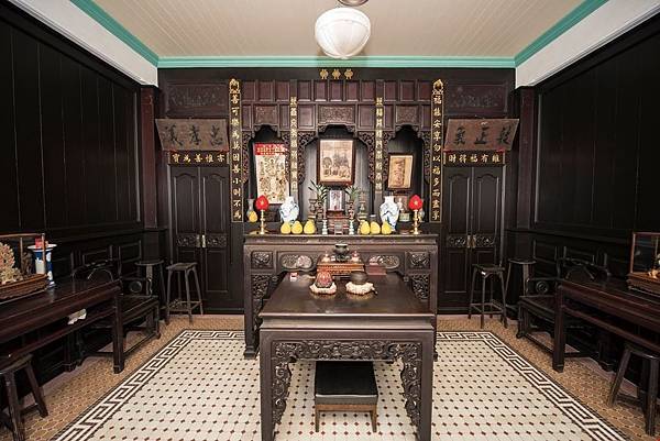 「新芳春行」三樓的公媽廳,其特色是尊王氏祖先於中位,神明安置於左右兩旁。(莊坤儒攝)