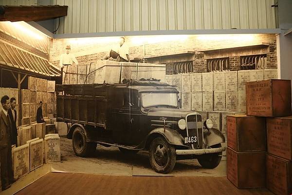「臺紅茶業文化館」內的老照片,用卡車裝載滿車茶箱的情形。