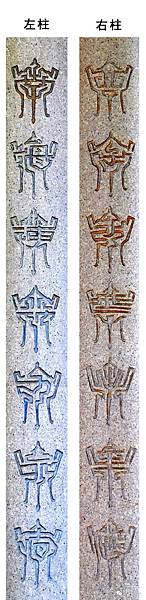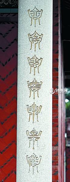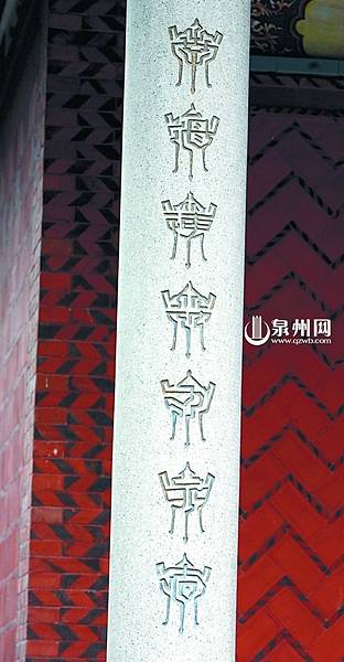 昨日下午,記者來到宿燕寺。該寺天王殿背後的走廊有8根柱子,其中6根柱子鐫刻的字體普通人都認得,可是在最左端和最右側的柱子上,各刻有7個類似小香爐的「圖案」。來自莆田的遊客許先生和朋友仔細認了許久,沒能認出是什麼:「這是字還是圖案呢?」