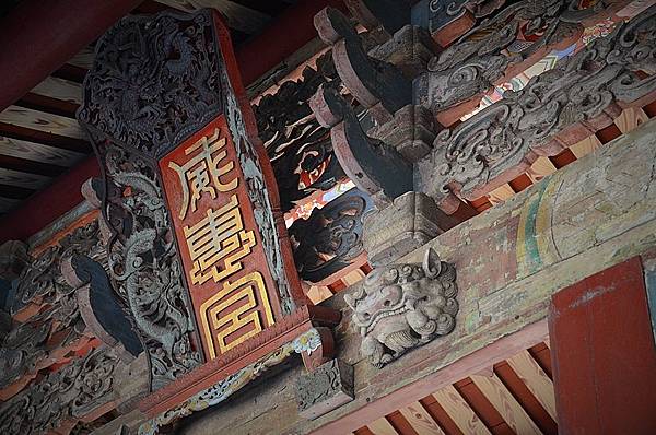 威惠宮為三進二院的建築格局,三川殿前有一座八字牆,左青龍右白虎的青斗石雕,雕工精緻,