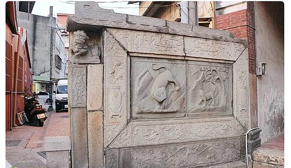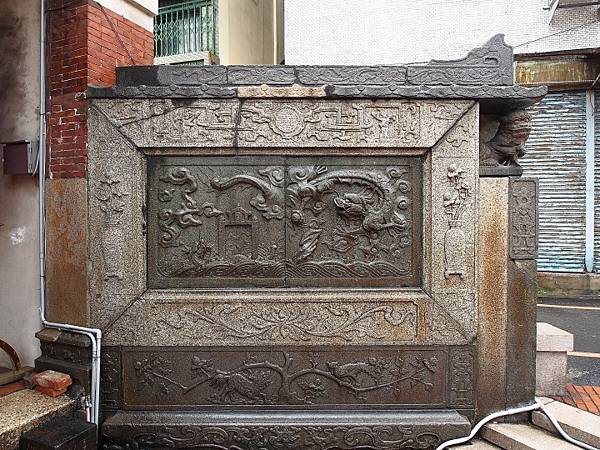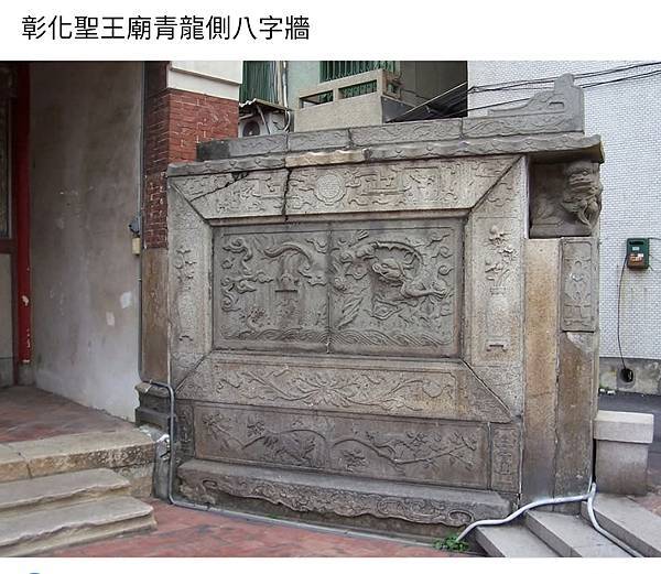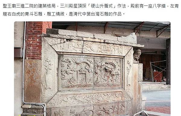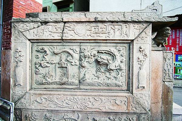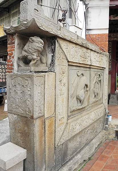(四)具稀少性,不易再現者:殿外兩側八字牆上,有材質精密的「剔地起突」石雕作品,以泉州石框圍,是不可多得的石雕藝術作品。