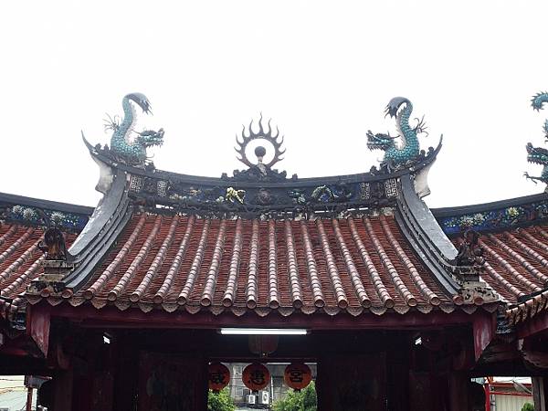三川殿前有一座八字牆,左青龍右白虎的青斗石雕,雕工精緻,是清領中期台灣石雕的作品。三川殿的屋頂採「硬山升簷式」作法。