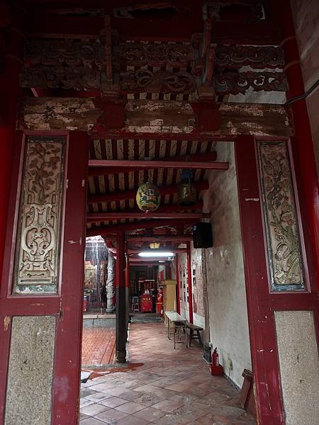 三川殿內的木雕棟架並不細緻,而門神彩繪已呈現剝落。
