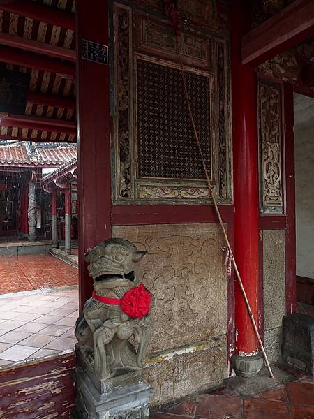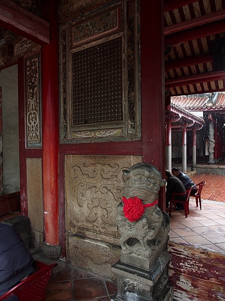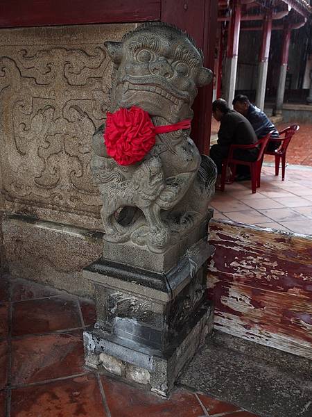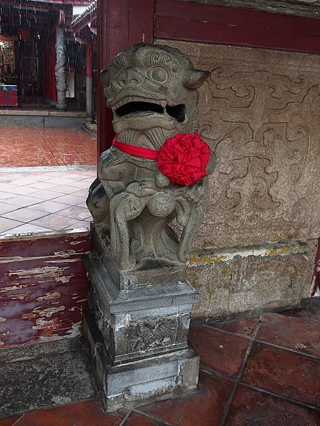 三川殿正門兩旁有一對石獅,雕刻工法蒼勁有力,造型古樸雅緻,為咸豐年間重修時的作品。