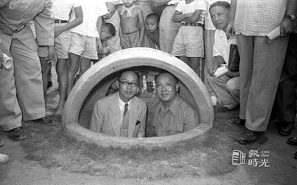 圖說:台灣民防司令部三十日在新公園棒球場舉行記者招待會,圖為台灣省府主席兼民防司令嚴家淦〈防空洞內左〉及副司令王成章〈防空洞內右〉鑽入簡易防空坑內體驗。