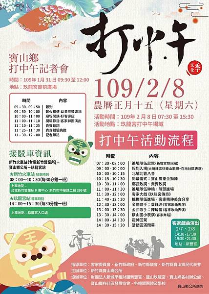 一年一度的寶山鄉迎神遶境『打中午文化季』即將在2020年2月8日元宵節當天盛大登場!今年除了歷年盛大的神明遶境、百人挑擔及千人食福的傳統客家年慶之外,也特別提前在農曆大年初七(1月31日)早上9時30分舉辦一場別開生面的『客家廟埕開講』及記者會,邀請交通大學客家文化學院人文社會系羅烈師教授跟大家分享客家慶典的小故事。
