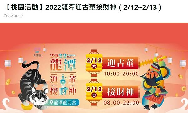 2022龍潭迎古董接財神將於2022/2/12~2/13舉辦,共計2天,活動地點在龍潭龍元宮一帶。迎古董接財神是龍潭重要的文化活動,日本昭和時期,龍潭以現今的菱潭新興基地為基準,分為上街與下街,上下兩街的居民會在元宵節當日以造型特異且誇張的裝扮遊街,並互相調侃,為市民之樂,此即迎古董,而隔日的接財神則是祈求賺錢,現今則合併舉辦成為迎古董接財神的活動。而類似於此的還有靚靚楊梅慶元宵,同樣也是楊梅當地的知名元宵活動。 【桃園活動】2022龍潭迎古董接財神 https://bit.ly/3JZ9WnR