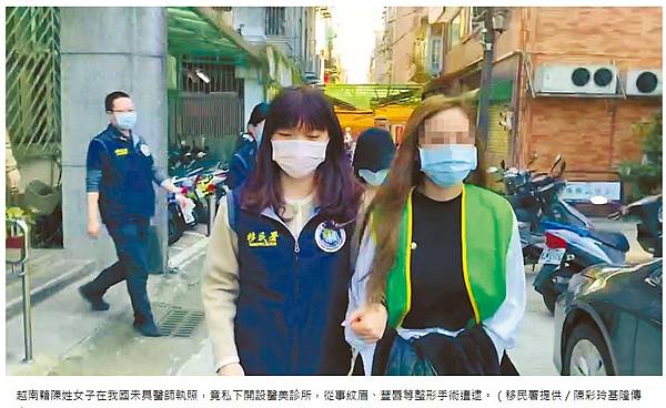 越南籍陳姓女子在越南從事美容工作,前年以製造業技工名義來台,在未具有中華民國醫師執照的情況下,開設地下醫美診所,從事紋眉、豐唇到割雙眼皮、隆鼻等整形手術,還在網路直播隆鼻手術等吸客。移民署專勤大隊等單位日前查獲陳女等3人,依違反醫師法、入出國及移民法等罪嫌移送桃園地方檢察署偵辦。