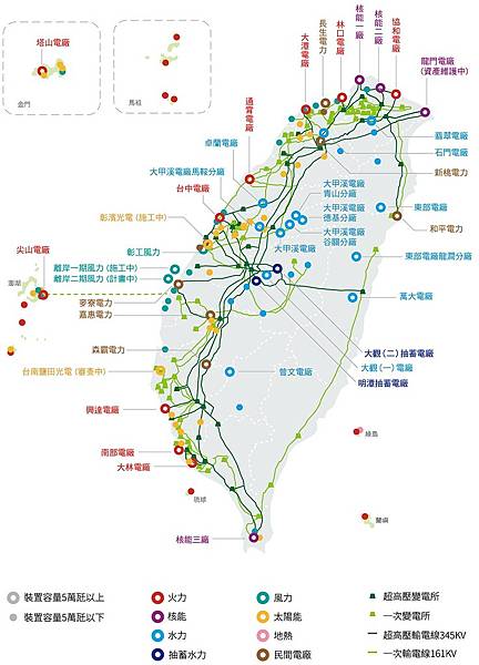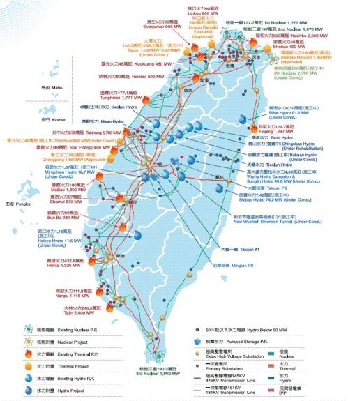 台灣電網及電廠的分布圖。 圖片來源:台電網站